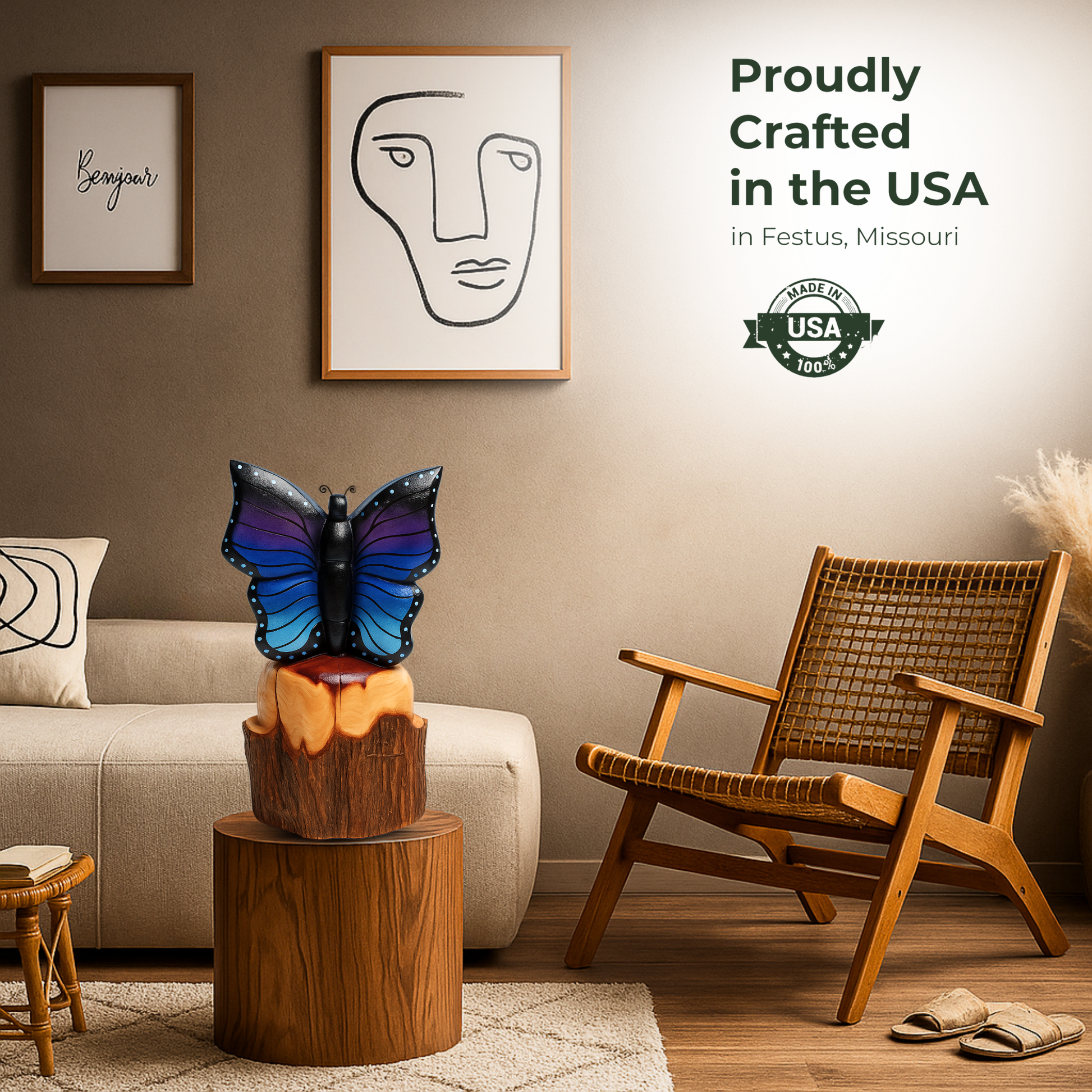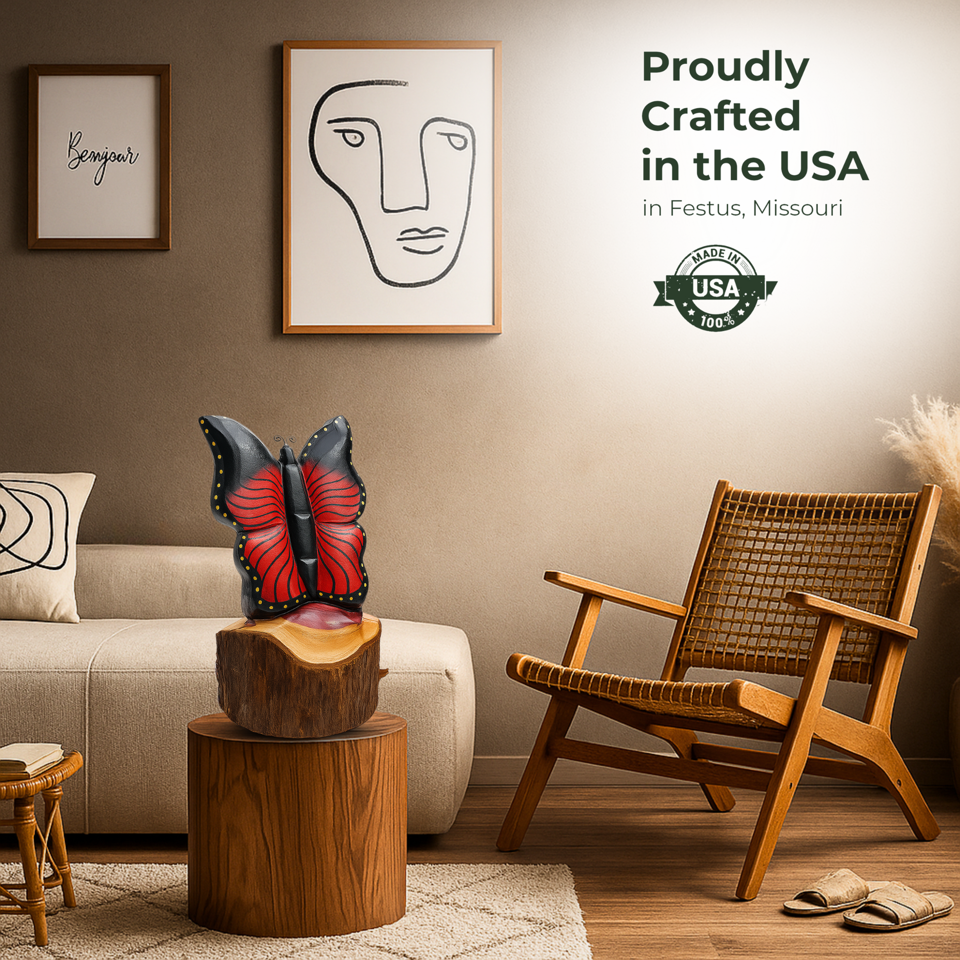 This butterfly sculpture brings warmth, artistry, and rustic charm to any setting — perfect for gardens, patios, porches, or interior décor. Its detailed craftsmanship and rich color contrast make it a standout piece of handmade art.
