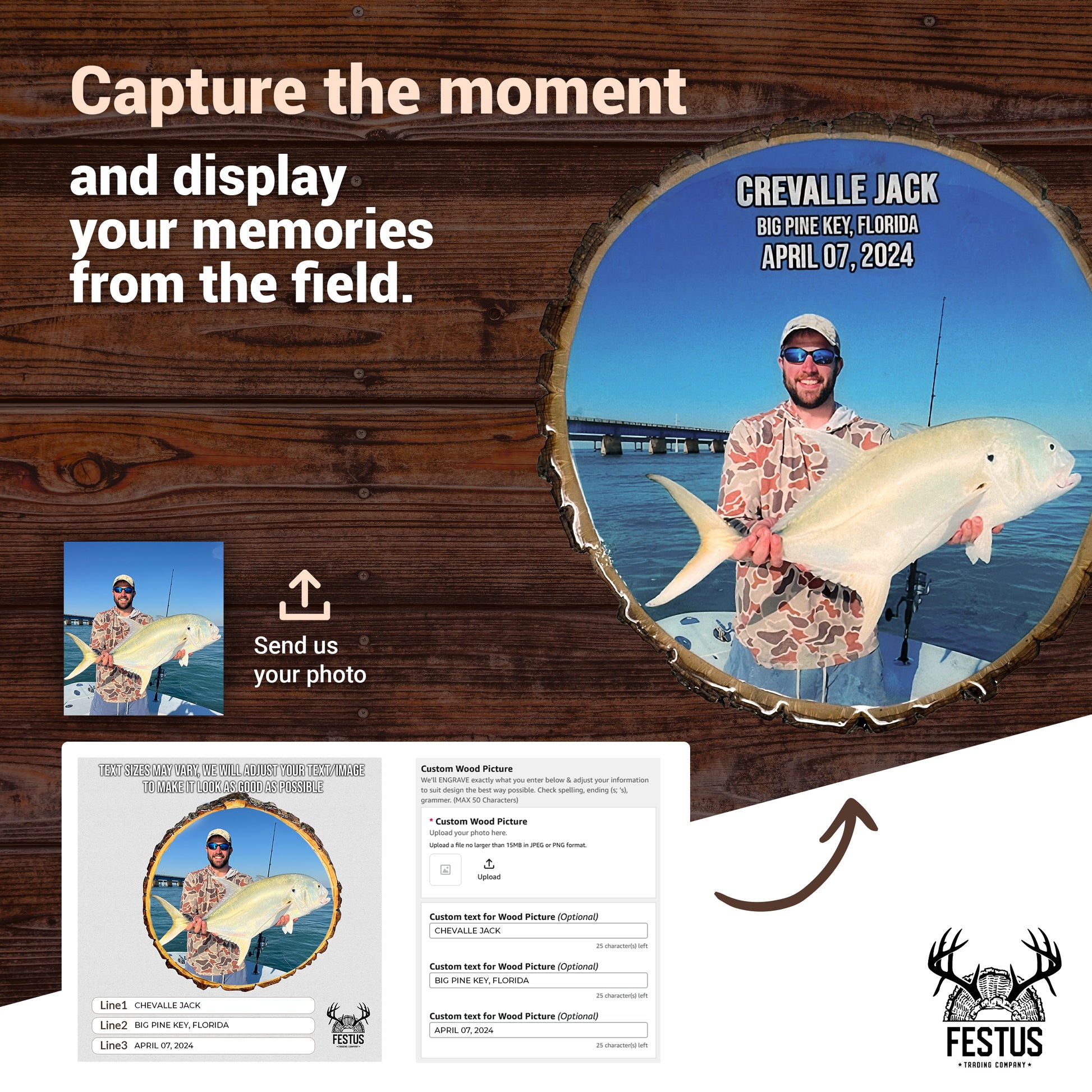 Turn your catch photo into a personalized handmade plaque that tells your fishing story beautifully.