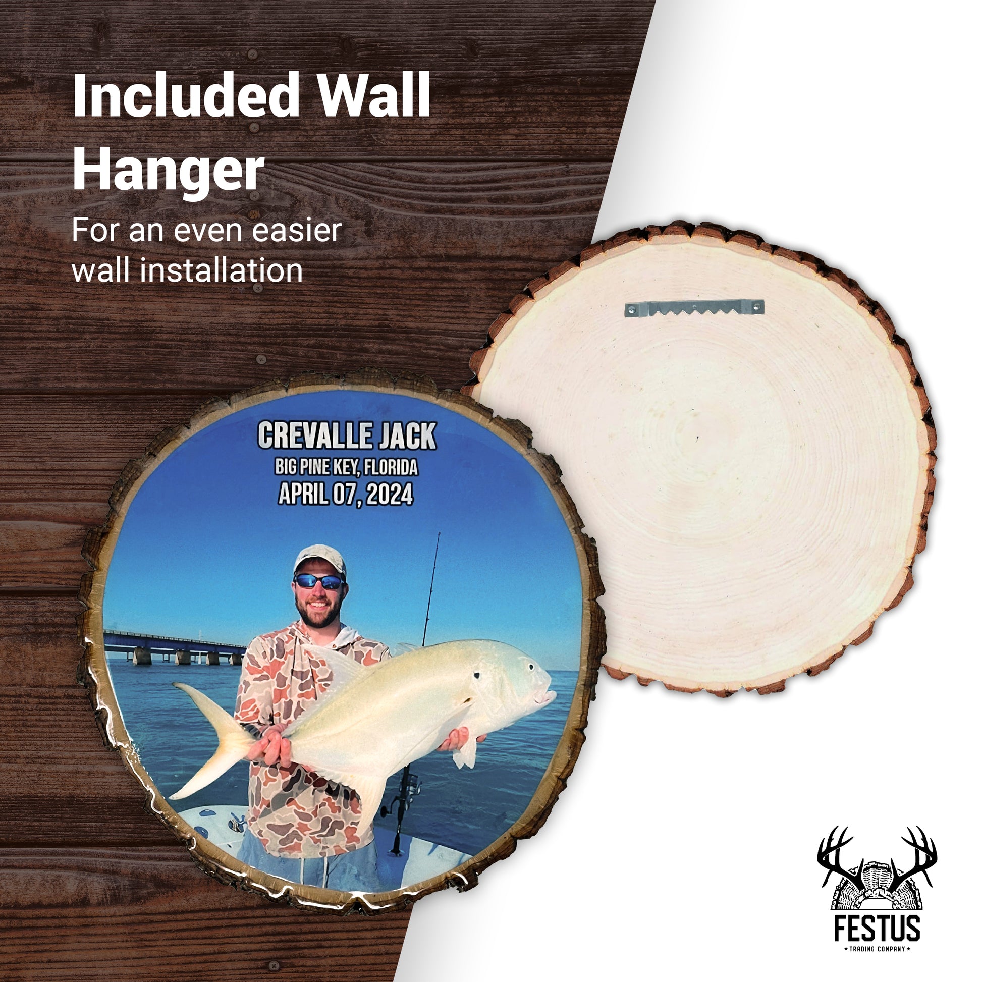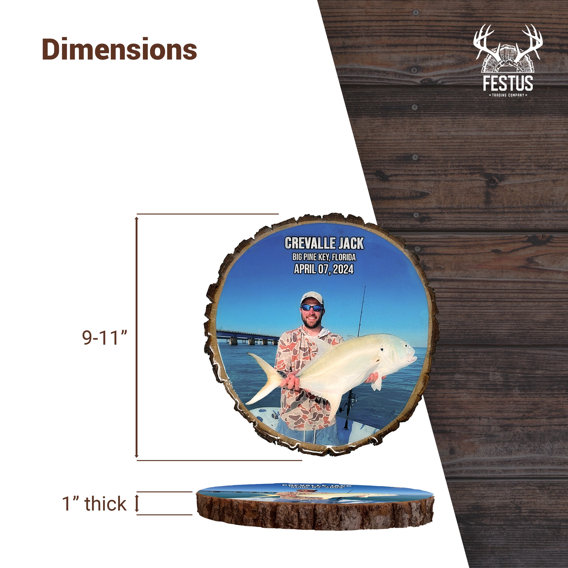 - Natural Wood Backing – Each plaque is made from real, sustainably sourced wood with live bark edges, adding a rustic, natural touch. Ideal for custom canvas prints or wall-mounted fishing memorabilia.