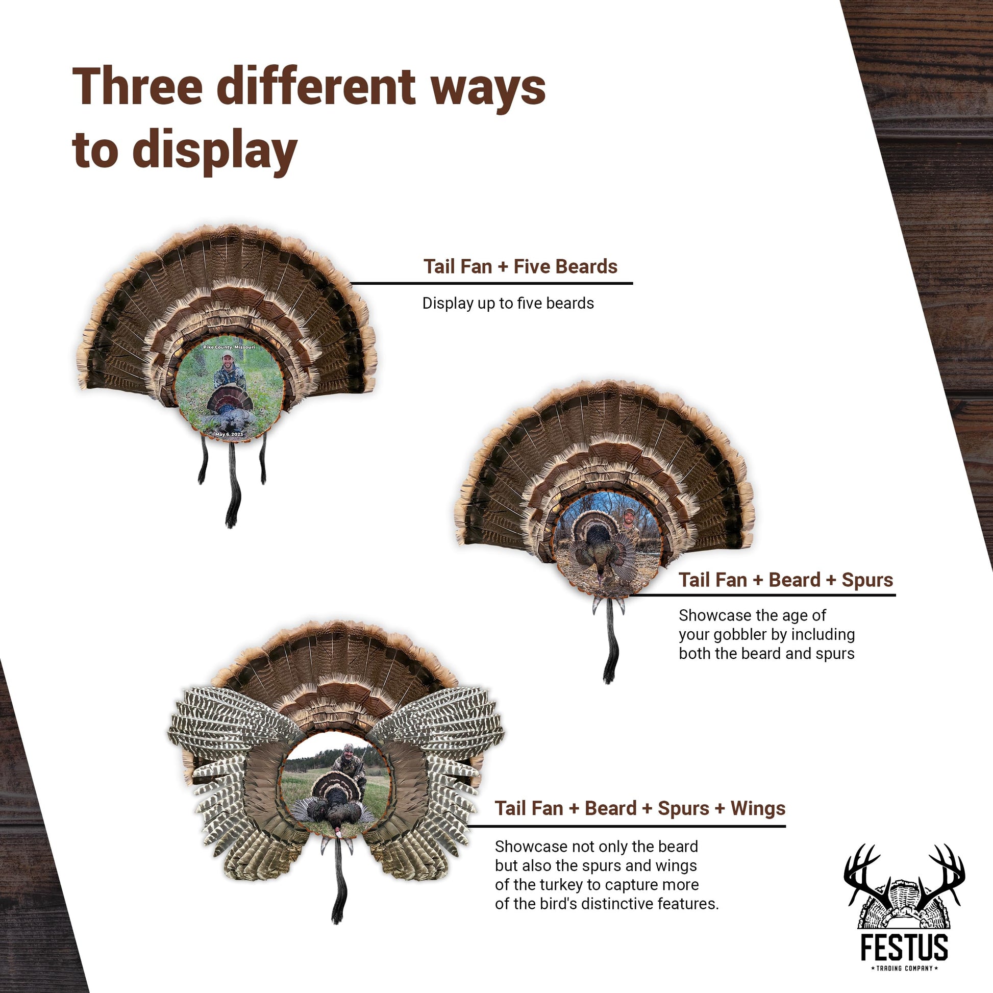 Custom Color Photo Turkey Fan Mounts: Our unique turkey fan with photo are custom-made in Southern Missouri, allowing customers to upload a photo to be included on the finished product.