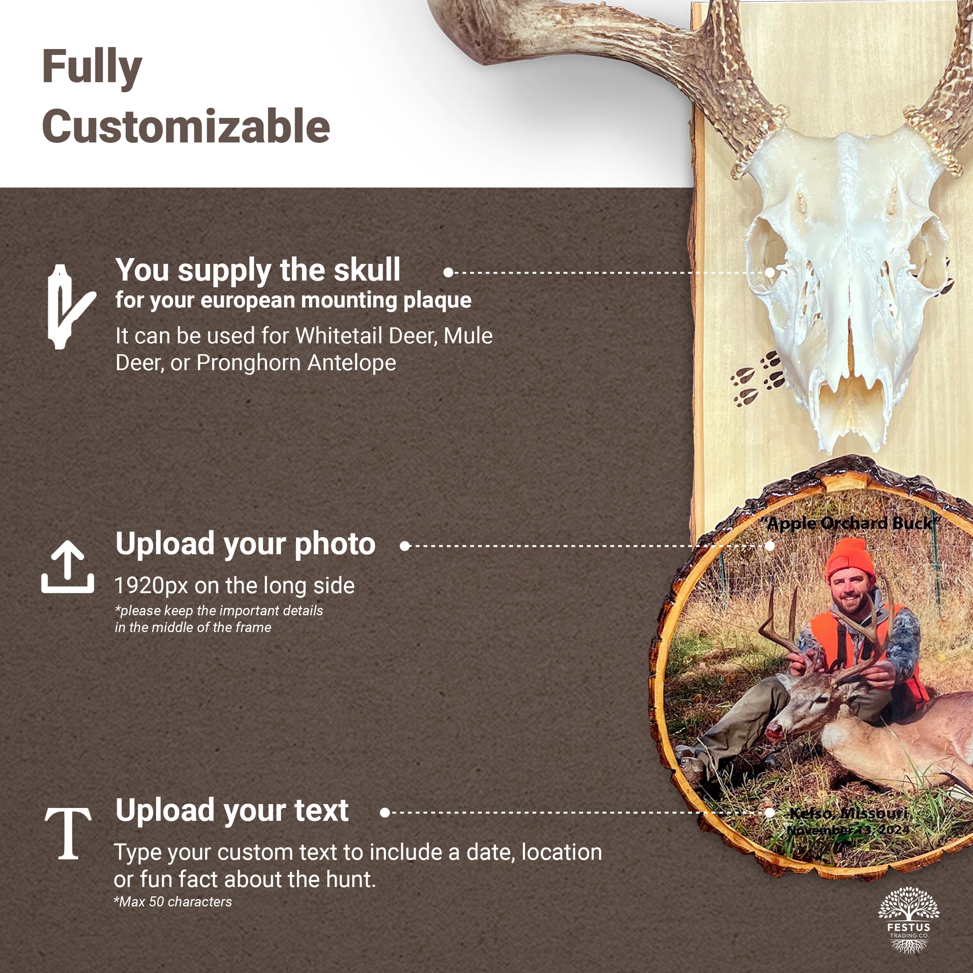 Elevate your trophy display with our European Mounting Plaque, designed with the discerning hunter in mind. This premium plaque features a customizable circular photo, protected by an epoxy resin finish that ensures your memories remain vivid and protected. The pivoting photo mount allows for perfect alignment, whether your display is on a desktop, at eye level, or elevated.