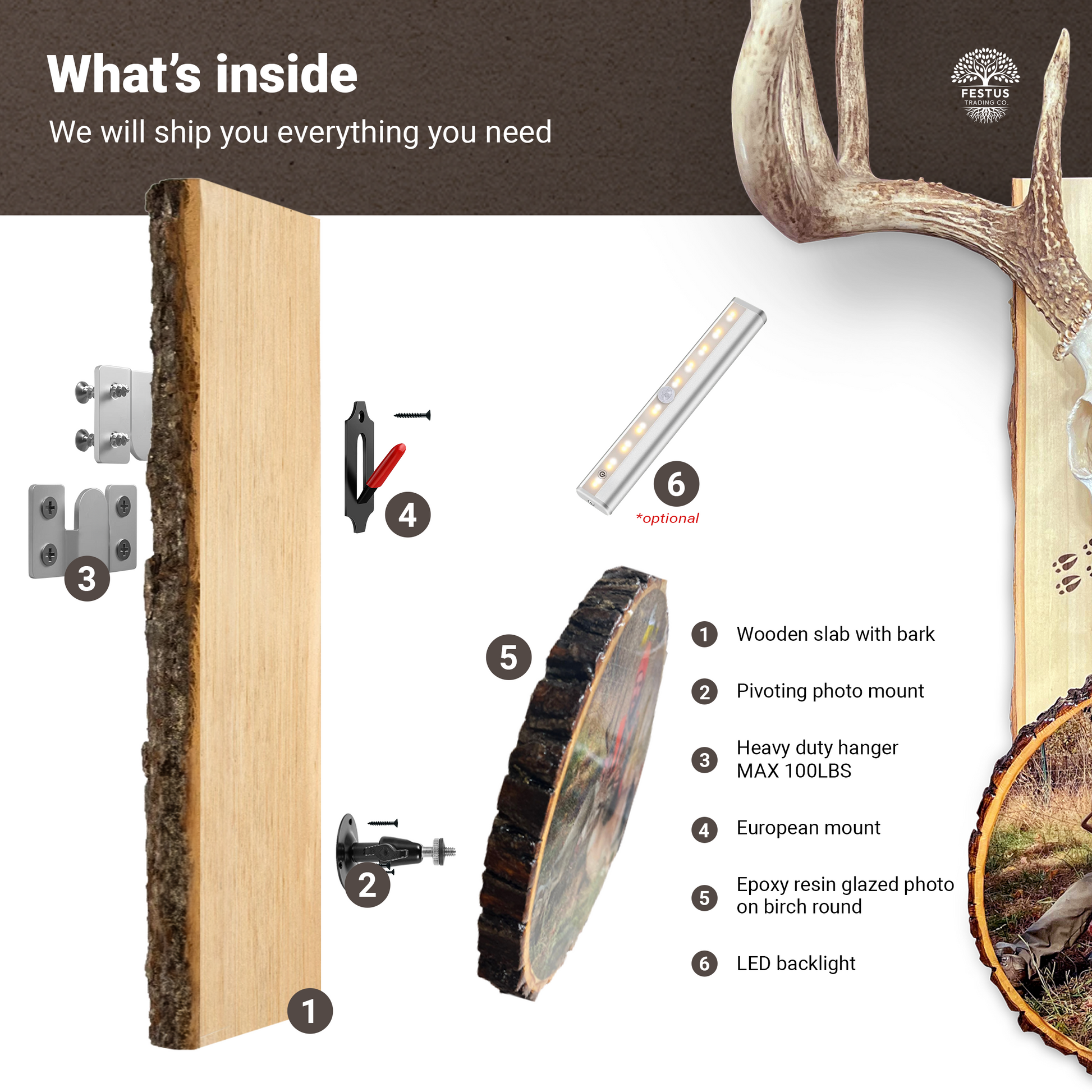 - Custom Color Photo or Engraving: Personalize your mount with a custom photo from the field to perfectly showcased on a live edge wood plaque with an epoxy resin finish for enhanced durability and elegance.