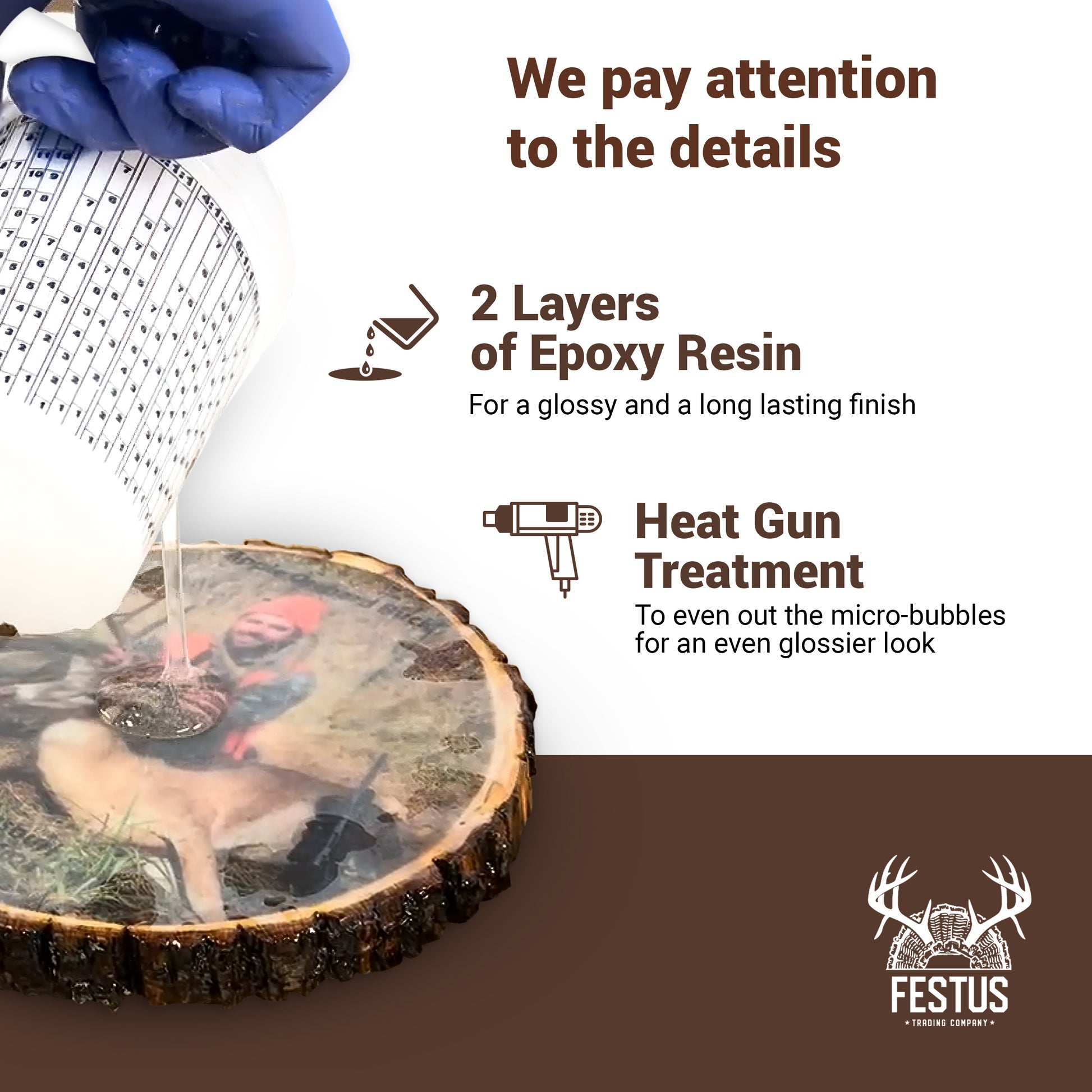 Transform your space with this rustic Fishing & Hunting Plaque, crafted from a natural live edge wood base and finished with premium epoxy resin. Each plaque is one-of-a-kind, showcasing authentic woodgrain enhanced by a glossy, durable surface that brings warmth and character to any cabin, lodge, or rustic home décor.