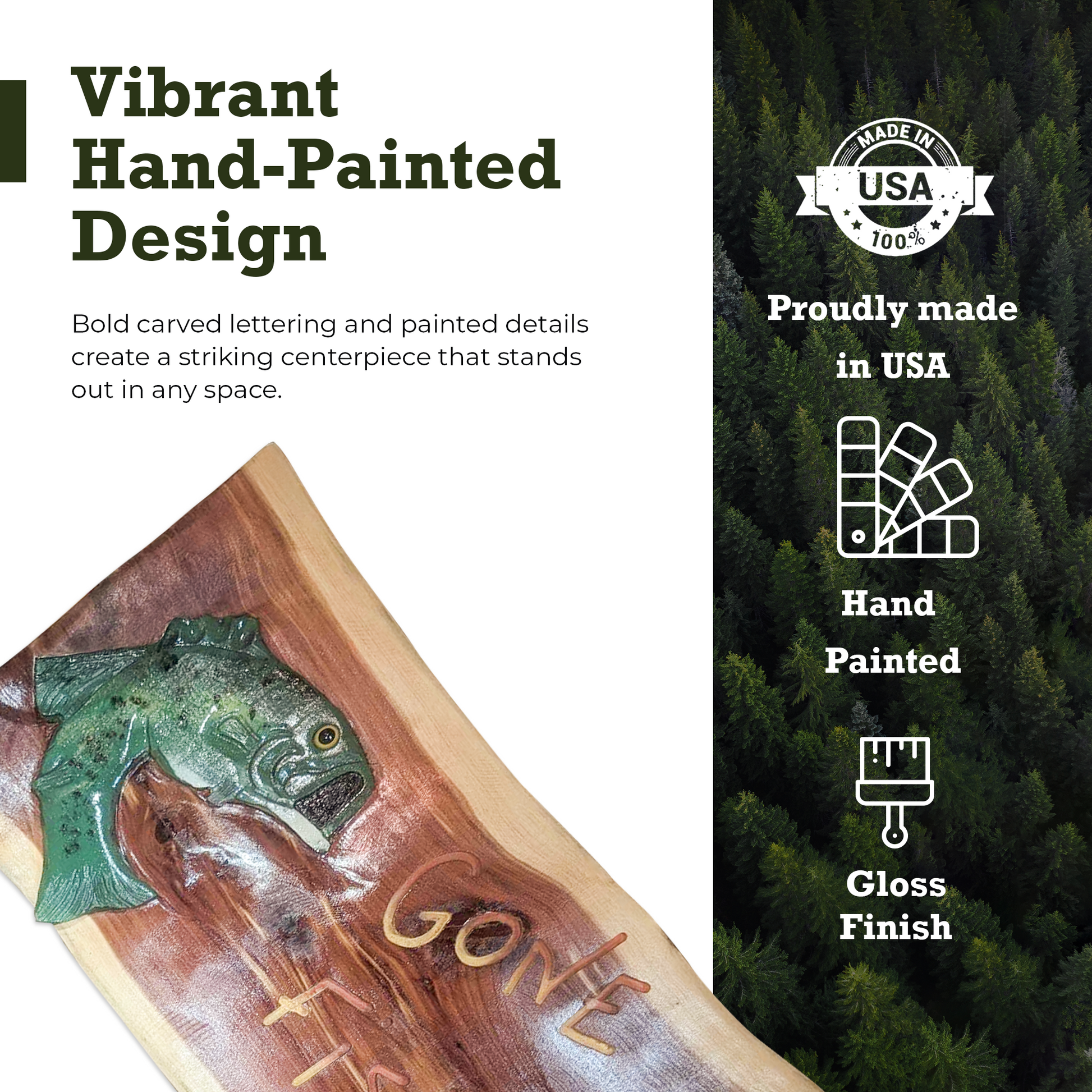 Handmade Cedar Wood Sign – Rustic “Gone Fishing’” Wall Décor with Carved Bass Design | Cabin, Lodge, Lake House, or Man Cave Gift