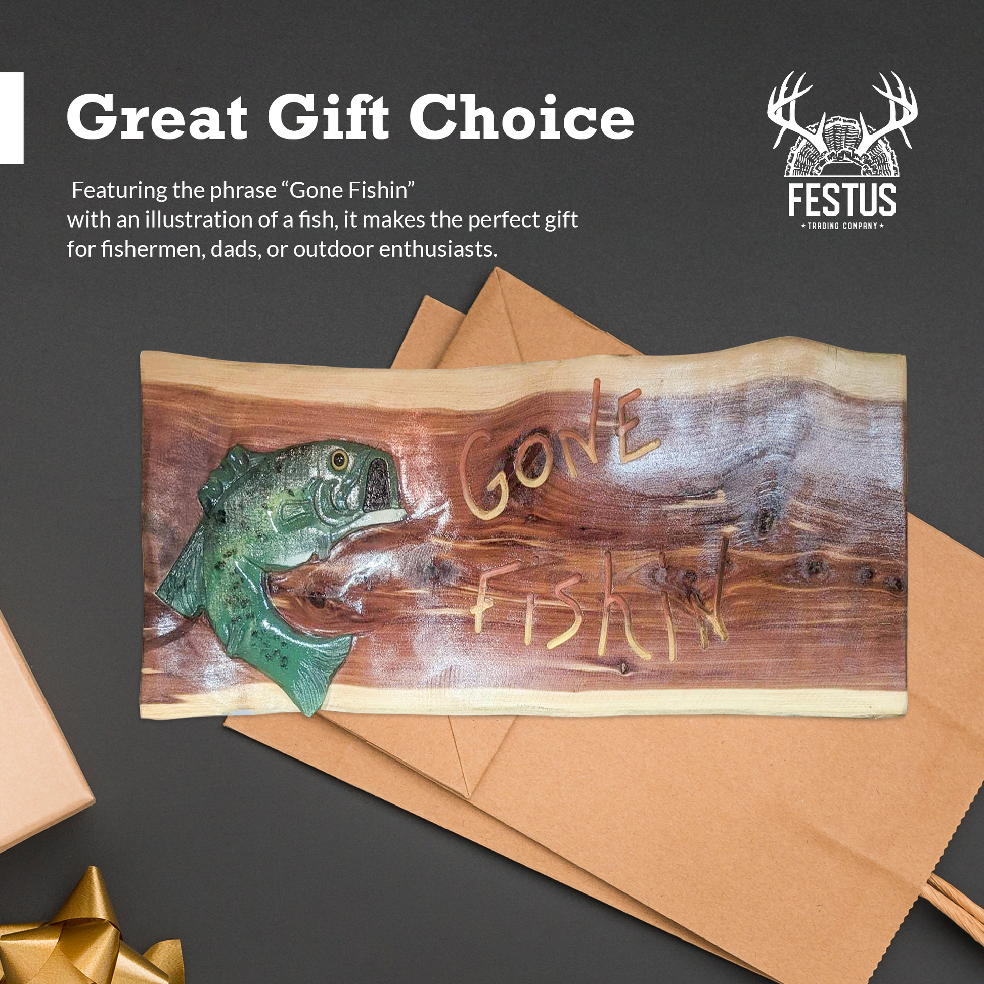 The design showcases a three-dimensional fish carving—a bass leaping into action—paired with “Gone Fishing’” text, making it the ultimate statement piece for any fishing cabin, lake house, or man cave. Its handcrafted quality ensures that no two signs are exactly alike, giving you a true one-of-a-kind piece.