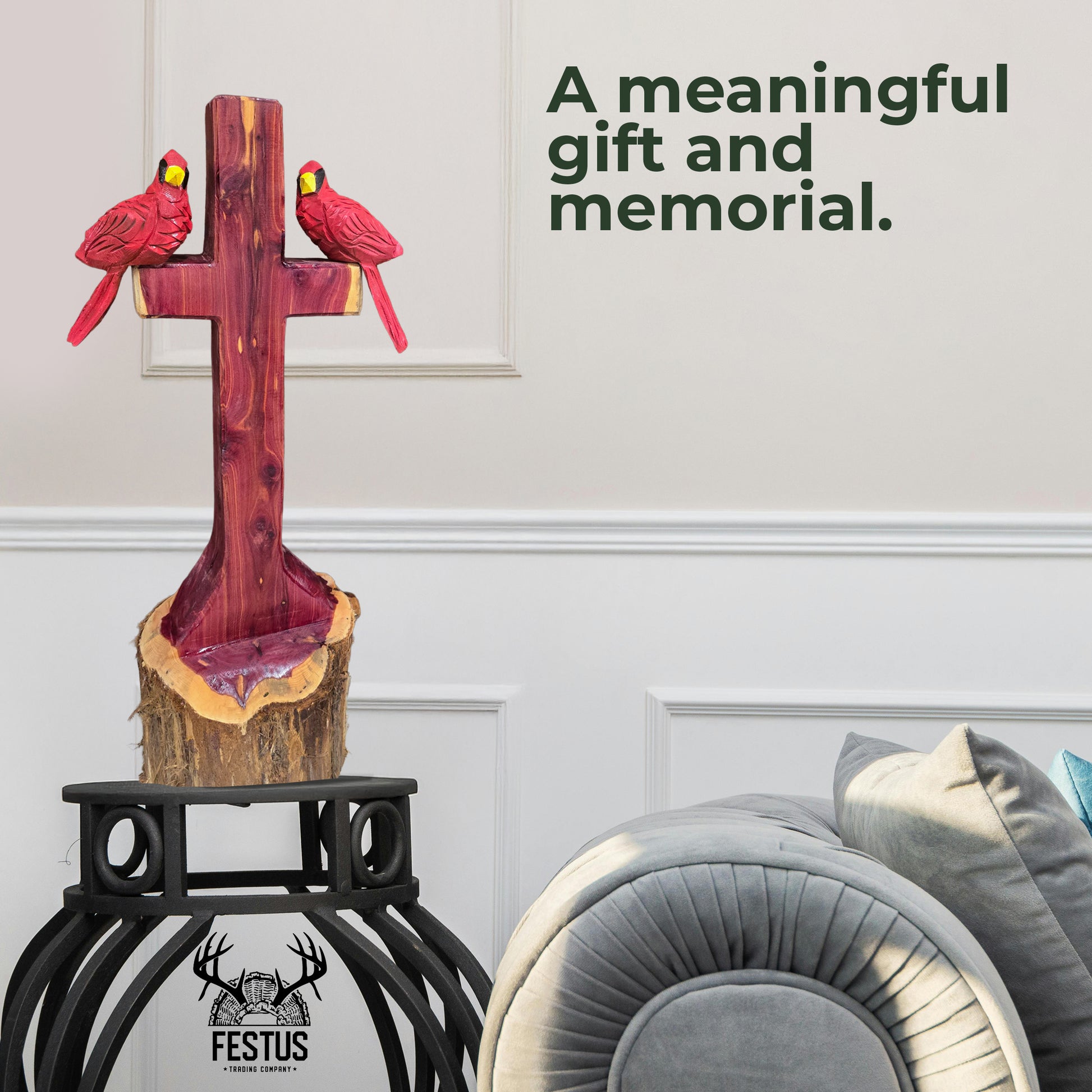 - Symbol of Love & Remembrance – Featuring two cardinals perched gracefully on a rustic cross, this piece is a heartfelt tribute to love, loss, and memory.