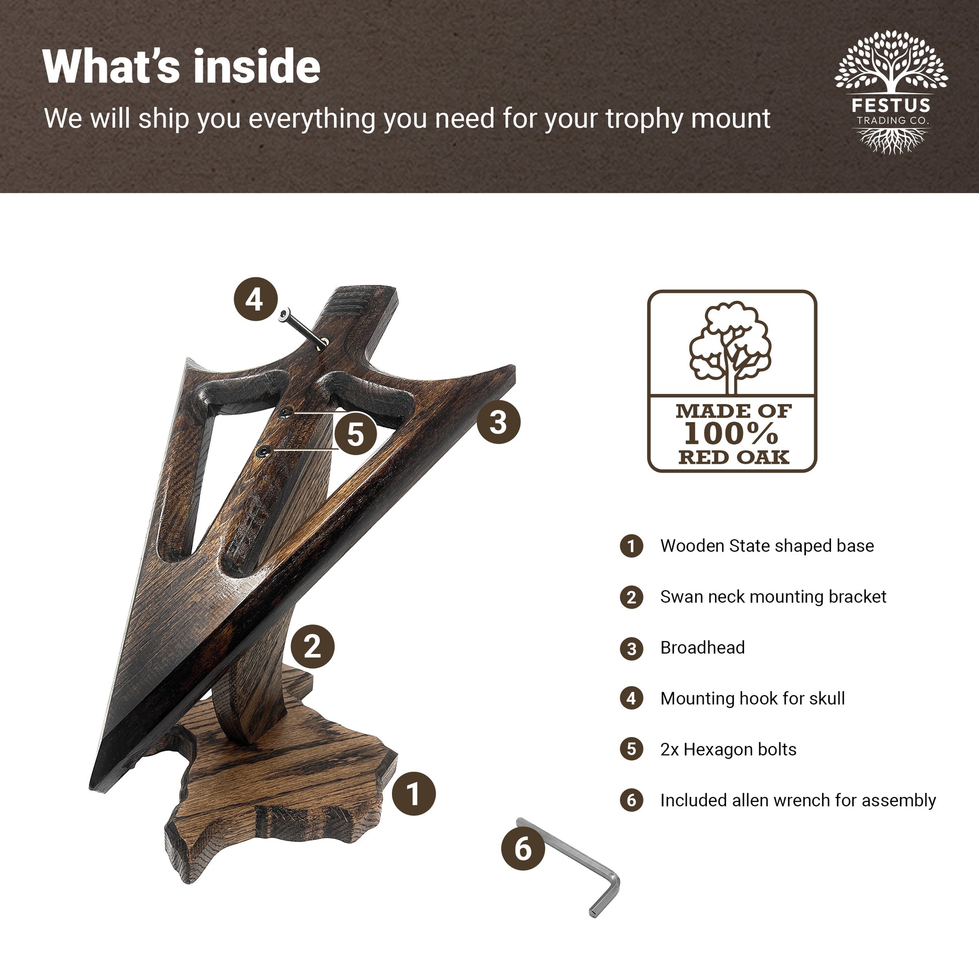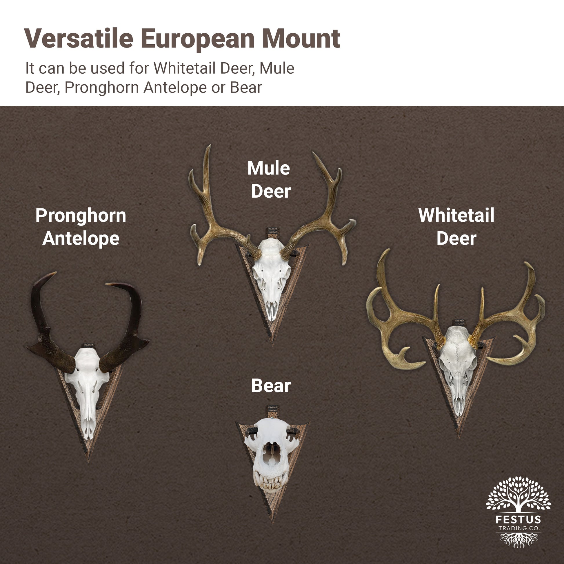 - Parts Included: This durable oak mount includes a base plate, arm, prong, and all necessary hardware. It’s designed for use with European mounts and sits securely on flat surfaces such as shelves, desks, or tables. Ideal for mounting your European deer skull mount or a deer European mount kit.